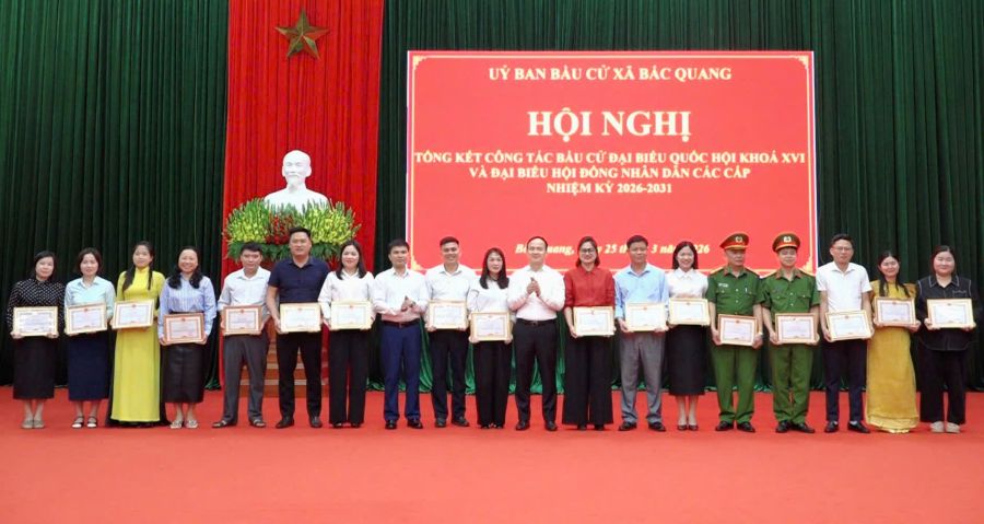 Chiều 25/3, Ủy ban bầu cử xã Bắc Quang tổ chức Hội nghị tổng kết công tác bầu cử đại biểu Quốc hội khóa XVI và đại biểu HĐND các cấp nhiệm kỳ 2026 – 2031. Các đồng chí: Trần Minh Hữu – Phó Bí thư Đảng ủy, Chủ tịch UBND xã, Chủ tịch Ủy ban bầu cử xã; Nguyễn Hồng Tuyên – Ủy viên Ban Thường vụ Đảng ủy, Phó Chủ tịch HĐND xã; Hoàng Thị Thu Thảo – Ủy viên Ban Thường vụ Đảng ủy, Chủ tịch Ủy ban MTTQ xã chủ trì Hội nghị. Dự và chỉ đạo hội nghị có đồng chí Phan Ngọc Hiệp – Ủy viên Ban Chấp hành Đảng bộ tỉnh, Bí thư Đảng ủy, Chủ tịch HĐND xã, Trưởng Ban Chỉ đạo bầu cử xã; cùng các đồng chí trong Thường trực Đảng ủy, HĐND, UBND, UBMTTQ xã; thành viên Ủy ban bầu cử, các ban, ngành, đoàn thể và đại diện các thôn trong toàn xã.